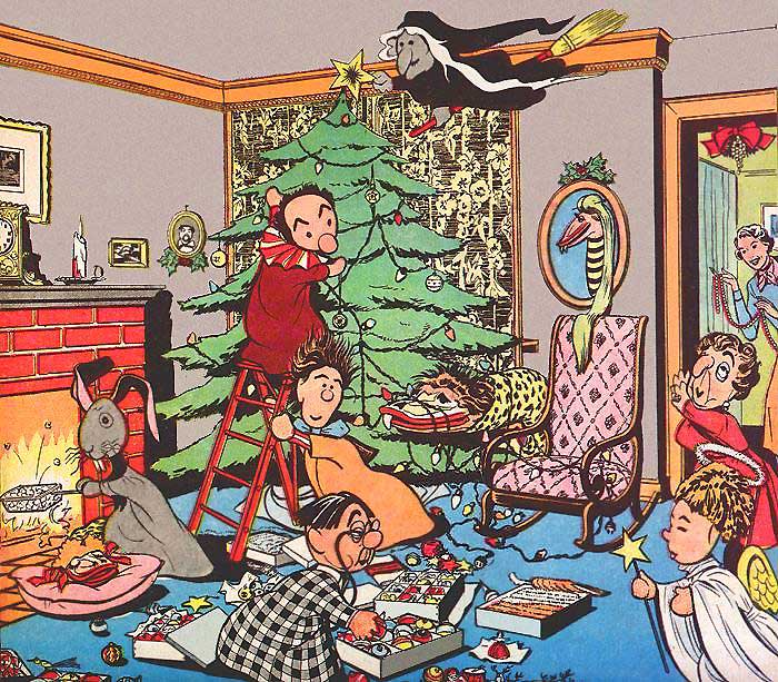 Well, it was a beautiful tree and it no time at all Cecil Bill and Ollie had a stand made and Kukla had brought down the ornaments from his closet. What a cozy evening it was! All the Kuklapolitans entered into the spirit. Madame Ooglepuss had hung some mistletoe up in the doorway and was waiting coyly for the colonel to notice her. Poor Doloras was so tired from the excitement that she had curled up beside Fletcher and fallen asleep while she watched him pop corn to string for the tree. Kukla had tried to reach the top of the tree with the star but the ladder wasn’t quite high enough so Buelah put it on with the help of her indoor broom. Fran was standing in the doorway stringing cranberries and kept reminding Cecil Bill to hold the ladder good and steady. Mercedes kept parading through the room rehearsing for the Christmas pageant and showing off her costume. Poor Ollie was trying to test the Christmastree lights and as usual, got completely wound up in his job. But when it was finished, Kukla said, “Fran, we say this every year, but I still think it’s the best tree we've ever had.”
