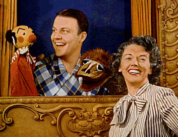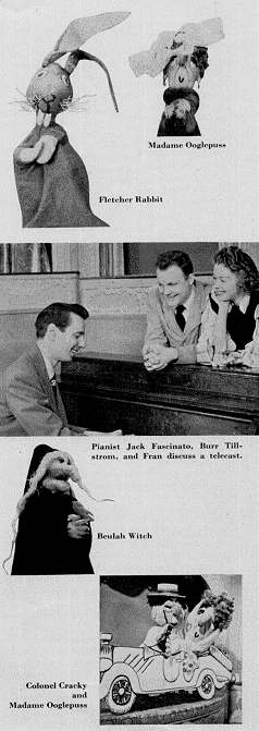 Burr's active interest in puppetry dates from the year he was fourteen, when a sister of the famous Tony Sarg encouraged him to construct marionettes of his own. In the mid-Thirties he worked with the Chicago Parks District Theatre and later took his act into carnivals, fairs, and night clubs. In 1939, just as he was all set to go to Europe with a marionette troupe, he was offered a chance to put on a weekly Saturday morning puppet show for children at the Marshall Field department store. He stayed in Chicago and ultimately did the first Balaban and Katz telecast over Station WBKB in 1941. That convinced him that television was the medium in which he could work at best advantage. When he first began doing a series in 1947, the sponsors wanted an hourlong program. Astonished at being offered so much time, Burr declared that he couldn't work alone - but at the same time, the idea of anybody else manipulating his own creations was unthinkable. He thereupon got in touch with Fran - who was then, as she is now, doing the Aunt Fanny part on Don McNeil's Breakfast Club. Fran, an Iowan, had been a schoolteacher before coming to Chicago, which may account in part for her patient, easygoing manner and her understanding of Burr's kids. She, Kukla, Ollie, and the rest got along very well from the beginning. The original sponsor, RCA, has been supplemented by two more, Sealtest and Ford; last year the show moved to WNBQ, the NBC outlet in Chicago.