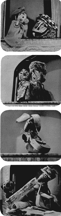 Above, I nearly wrote that Ollie frowned. Such is Burr's artistry; the faces of his fist puppets, of course, do not change. But their voices are so expressive, their movements so well articulated; that after a few minutes of watching the show one forgets - as indeed Fran has demonstrated - that they are not actual persons. Even Burr is captured by the illusion; one day he produced a record and said he wanted me to hear what happened when Ollie lost his hair (Kukla had been experimenting with a permanent-wave machine). All through the show, sitting on the floor by the phonograph, Burr seemed to be hearing the voices for the first time; it was as though he were a total stranger who had had nothing to do with the performances.