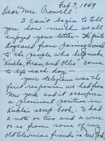 ____________ This letter was written to my grandmother, Dorothy Walworth Crowell - a novelist and journalist who wrote about Burr in the Reader's Digest. They instantly became friends, and Burr even traveled to her house - along with Fran, Kukla and Ollie - to give a private birthday show for my brother. Burr also showed his friendship by naming Ollie's "Aunt Dorothy" after my grandmother (although you never actually saw this Kuklapolitan character - Ollie would only talk about his Aunt Dorothy). Burr's letter is filled with many insightful details about his early days in television, along with many charming and humorous references to his "kids" - Kukla and Ollie. I hope you enjoy it.