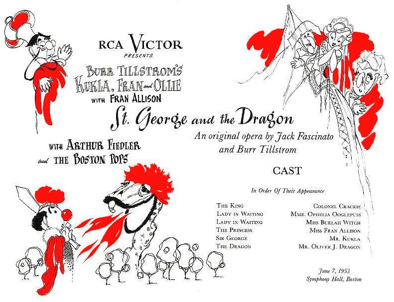 On June 7, 1953, the Kuklapolitans starred in St. George and the Dragon with Arthur Fiedler and the Boston Pops at Symphony Hall in Boston. The show was a hit, and so was the program, thanks to typically fine graphics by Ted Drake.