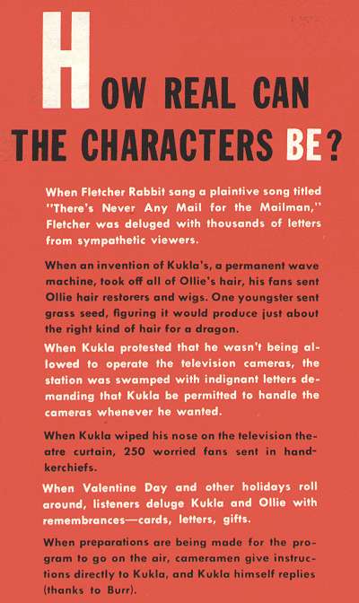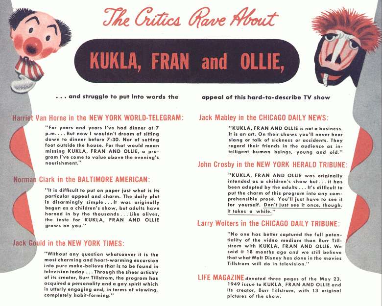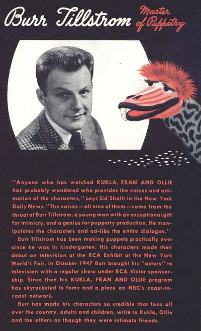 The answer can be given in two words: Burr Tillstrom. Burr was the creator of "Kukla, Fran and Ollie," and the only puppeteer on the show, which first ran from 1947 to 1957. Today, it's hard to imagine a simple puppet show being so popular, but KFO evoked not only loyalty but also a deep belief in its characters from anyone who watched more than a few episodes. Here are a few examples from a 1949 KFO booklet: