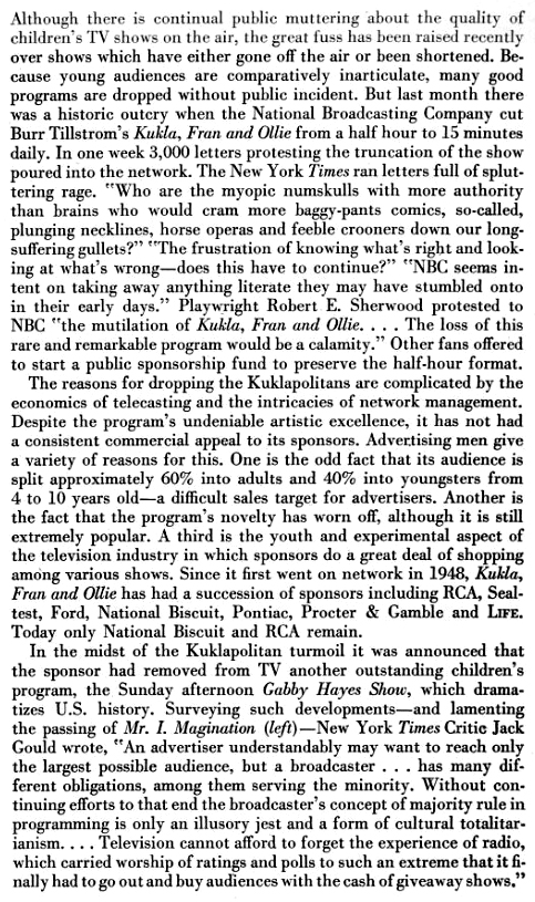 Although there is continual public muttering about the quality of children's TV shows on the air, the great fuss has been raised recently over shows which have either gone off the air or been shortened. Because young audiences are comparatively inarticulate, many good programs are dropped without public incident. But last month there was a historic outcry when the National Broadcasting Company cut Burr Tillstrom's Kukla, Fran and Ollie from a half hour to 15 minutes daily. In one week 3,000 letters protesting the truncation of the show poured into the network. The New York Times ran letters full of spluttering rage. "Who are the myopic numskulls with more authority than brains who would cram more baggy-pants comics, so-called, plunging necklines, horse operas and feeble crooners down our long-suffering gullets?" "The frustration of knowing what's right and looking at what's wrong - does this have to continue?" "NBC seems intent on taking away anything literate they may have stumbled onto in their early days." Playwright Robert E. Sherwood protested to NBC "the mutilation of Kukla, Fran and Ollie. . .The loss of this rare and remarkable program would be a calamity." Other fans offered to start a public sponsorship fund to preserve the half-hour format.