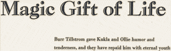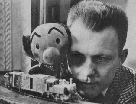 His father helped Burr endow speechless creatures with personality. The family spent summers at Benton Harbor and, as soon as Dr. 'Tillstrom arrived for weekends, Burr and his older brother, Dick, demanded stories. Some the father read from Alice in Wonderland and The Wizard of Oz. Others he made up as he led the boys on long rambling walks through the open country. Creatures took on character. A scurrying rabbit was a messenger carrying important news. A bird's song had words. The seldom-used track, meandering along the creek bed, became "the pumpkin vine railroad." Burr recalls, "Everything had personality - and two personalities made a plot."