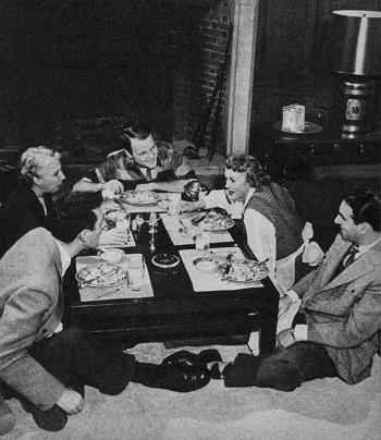 ![]() Nothing could be more informal than the way the meal is served. Because he's the tallest, Joe Lockwood takes down the dark pottery plates and places them on the low shelves, ready for dishing up. Whichever one of us is most ambitious gathers up the magazines from the coffee table and puts on straw place mats and silver. Then we plunk down and sit on the floor, backs against the sofas. Conversation stops while we eat, for all of us like good food. It flares up again as the plates are cleared and the ice cream and the coffee comes on. Little Cathy Morgan curls up with a magazine. Gommy fetches the corn popper, Mary gets a bowl and butter, and with such fare, the party goes for hours. |