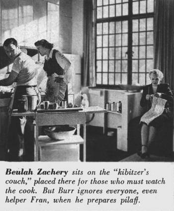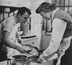 ![]() Festivities usually start with Mary filling the percolator, for we're all terrific coffee drinkers. Gommy and Archie set up the motion picture projector. The white, uncluttered wall serves as a screen, and soon we all sit back, coffee cup in hand, to watch the kinescope recordings of past shows. Just about then some one decides to cook. When Burr officiates, it's usually chicken and rice pilaff because he knows I love it. Again, keeping things as simple as possible, he always buys the cut-up chicken so that all he has to do is open the package, roll the pieces in flour, and brown them in a frying pan holding a half-and-half mixture of butter and shortening. As soon as they reach that golden brown crusted stage, he adds about a half cup of water, covers the pan and turns down the flame to let the chicken simmer slowly. |