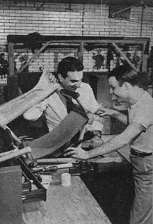 The bathroom is something. Serving as dressing room also, its floor is covered with a cotton shag rug of mixed brown and white. The double dresser is gray-beige enamel and above it is a huge mirror. Although the mirror appears extravagant it actually is utilitarian, for there's where Burr rehearses Kukla and Ollie. He tells me that his best ideas always come while shaving. When a brainstorm strikes, he'll drop his razor and turn puppeteer. Manipulating his hands before that mirror, he'll work out things which he wants Kuke and Ollie to do on the show.