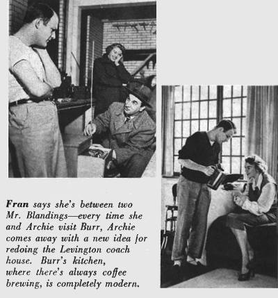 Studio conversation was parallel. In the midst of a story conference, Burr would suddenly get the same far-away look in his eyes and ask, "Fran, should my furniture be last-word modern, or should I stick to antiques?"