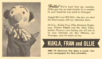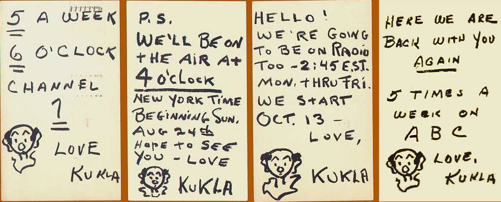 These cards were sent to viewers in the early 50s to announce changes in KFO's schedule, and to publicize their radio show. The first four were hand-lettered and drawn by Burr, to give the feeling of personal notes from Kukla. Click on the cards below to hear excerpts from the first KFO radio show: October 13, 1952. (You can buy two KFO radio shows from Radio Memories.)