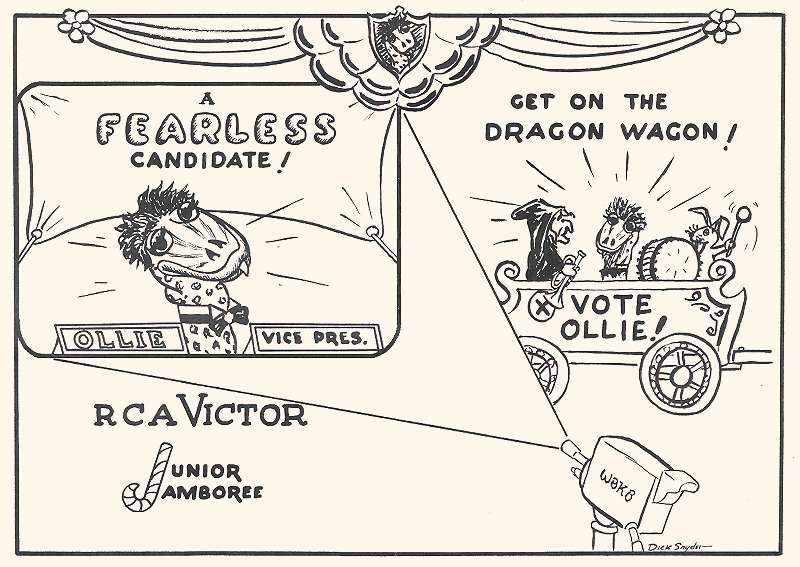 This large (9½ x 13), single-fold postcard was probably sent to viewers in 1948, shortly after the show went on the air and before it was renamed Kukla, Fran and Ollie. Perhaps it was an attempt to determine viewership and to build a mailing list. The art is by Dick Snyder.