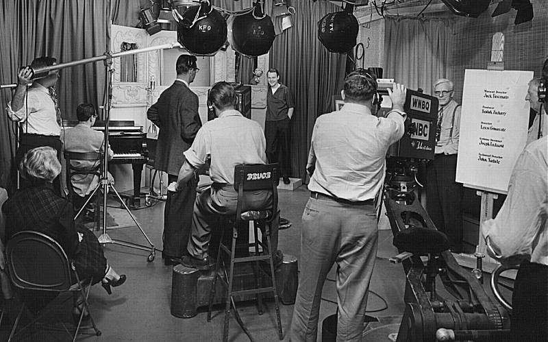 The KFO studio at WNBQ in 1951. From left to right: Beulah Zachary, producer (seated); Harry Glyer, boom operator; Jack Fascinato, composer (at piano); John Kinsey, stage manager; Bruce Berquist, cameraman; Kukla and Burr Tillstrom; Jim Edwards, cameraman; John Casagrande and Jimmy Lynch (stagehands).