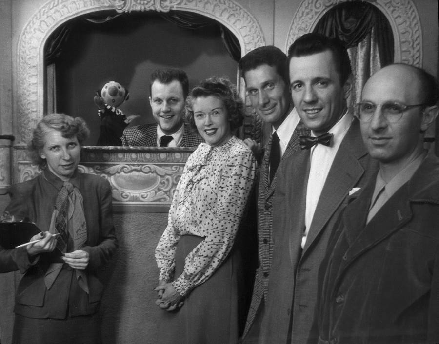 The KFO team in 1949. From left to right: Beulah Zachary, Kukla, Burr Tillstrom, Fran Allison, Joe Lockwood, Jack Fascinato and Lewis Gomavitz.