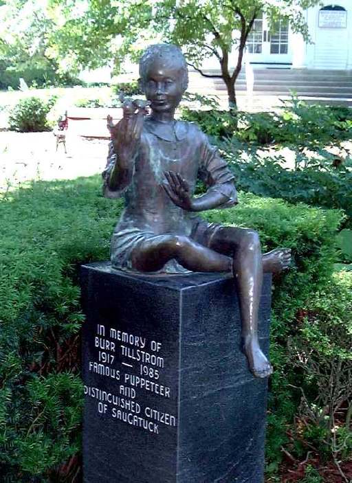 Saugatuck Douglas Art Club commissioned Patricia Daggett to create this statue of a young girl holding a puppet, as a tribute to Burr. It was dedicated on