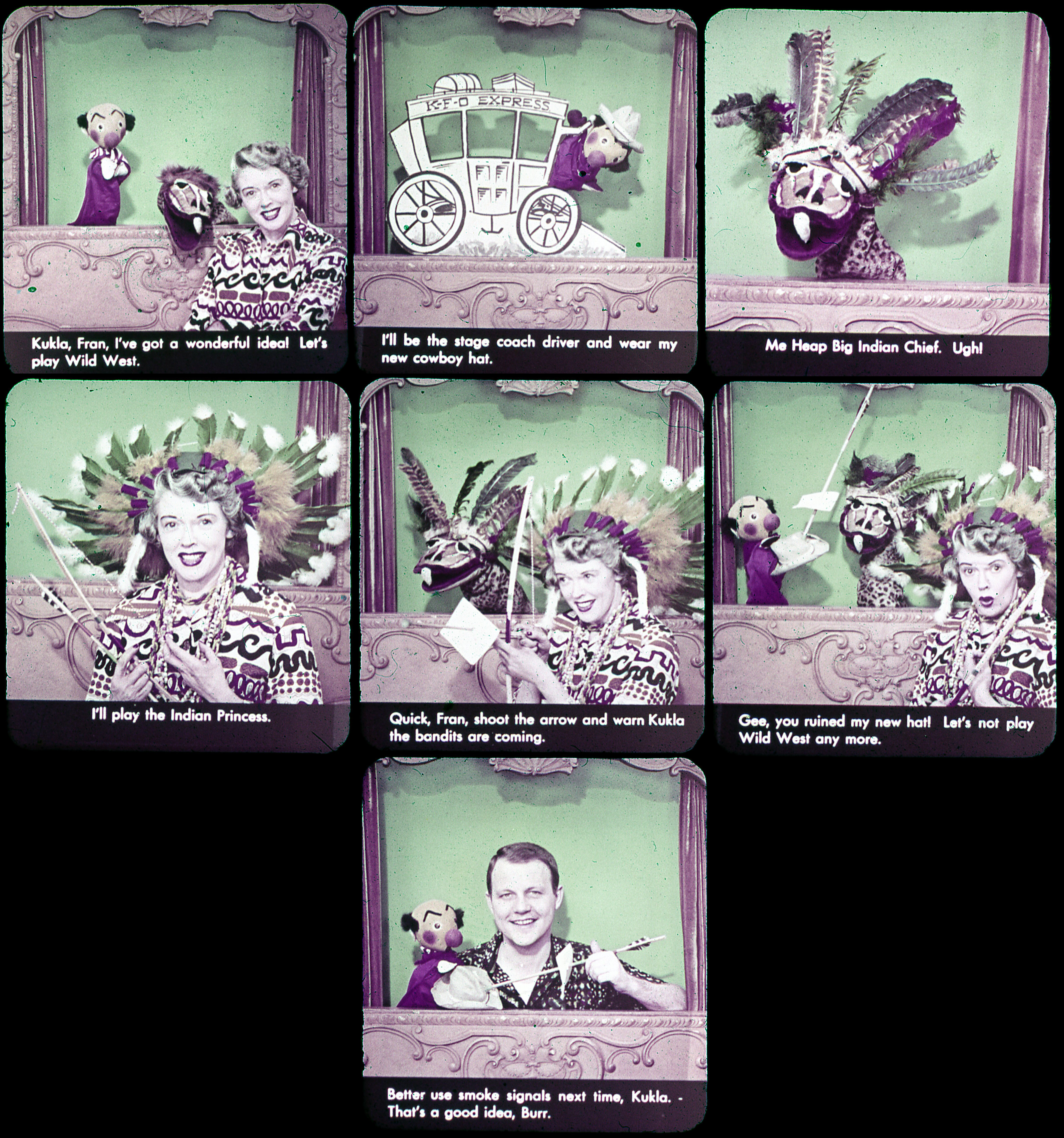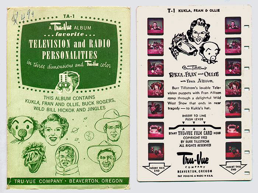 The "Kukla, Fran and Ollie" card has a copyright date of 1953, and was available individually or as part of the "Televison and Radio Personalities" set, which included cards for "Buck Rogers" and "Wild Bill Hickock" (played by Guy Madison, shown modeling the Tru-Vue). The drawings on the card itself are taken from the official KFO letterhead. |